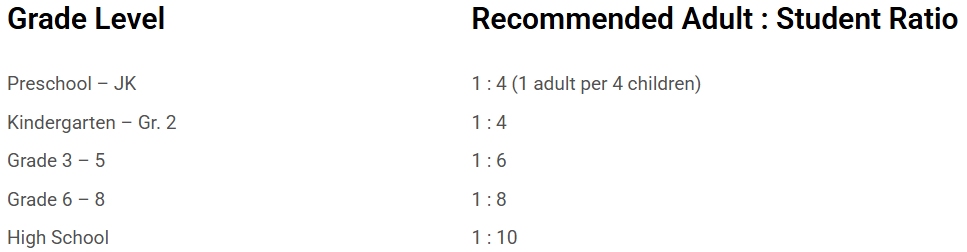 To ensure proper supervision and safety, we recommend the following adult-to-student ratios for school groups (minimum chaperone requirements may vary by school board policy):